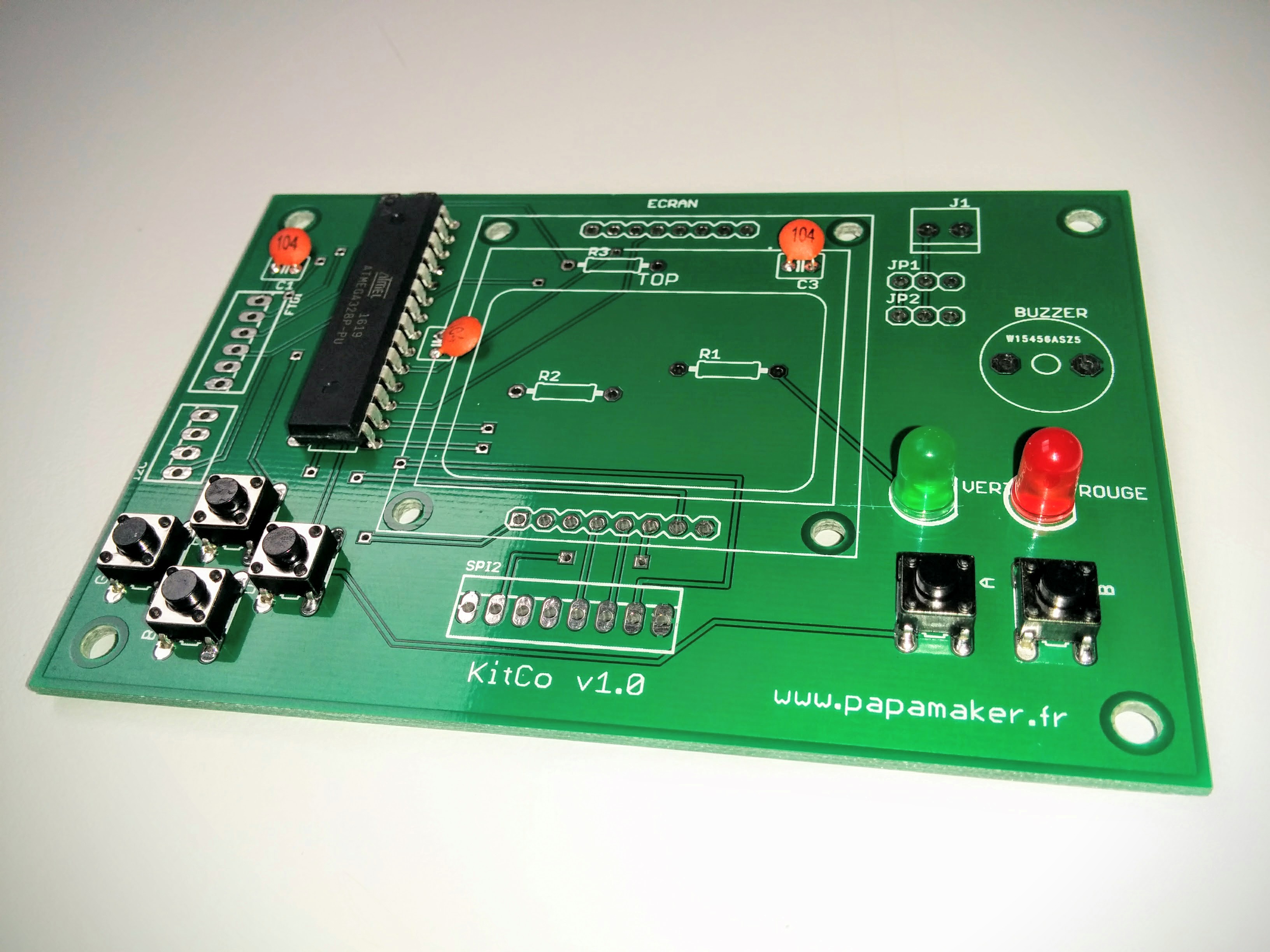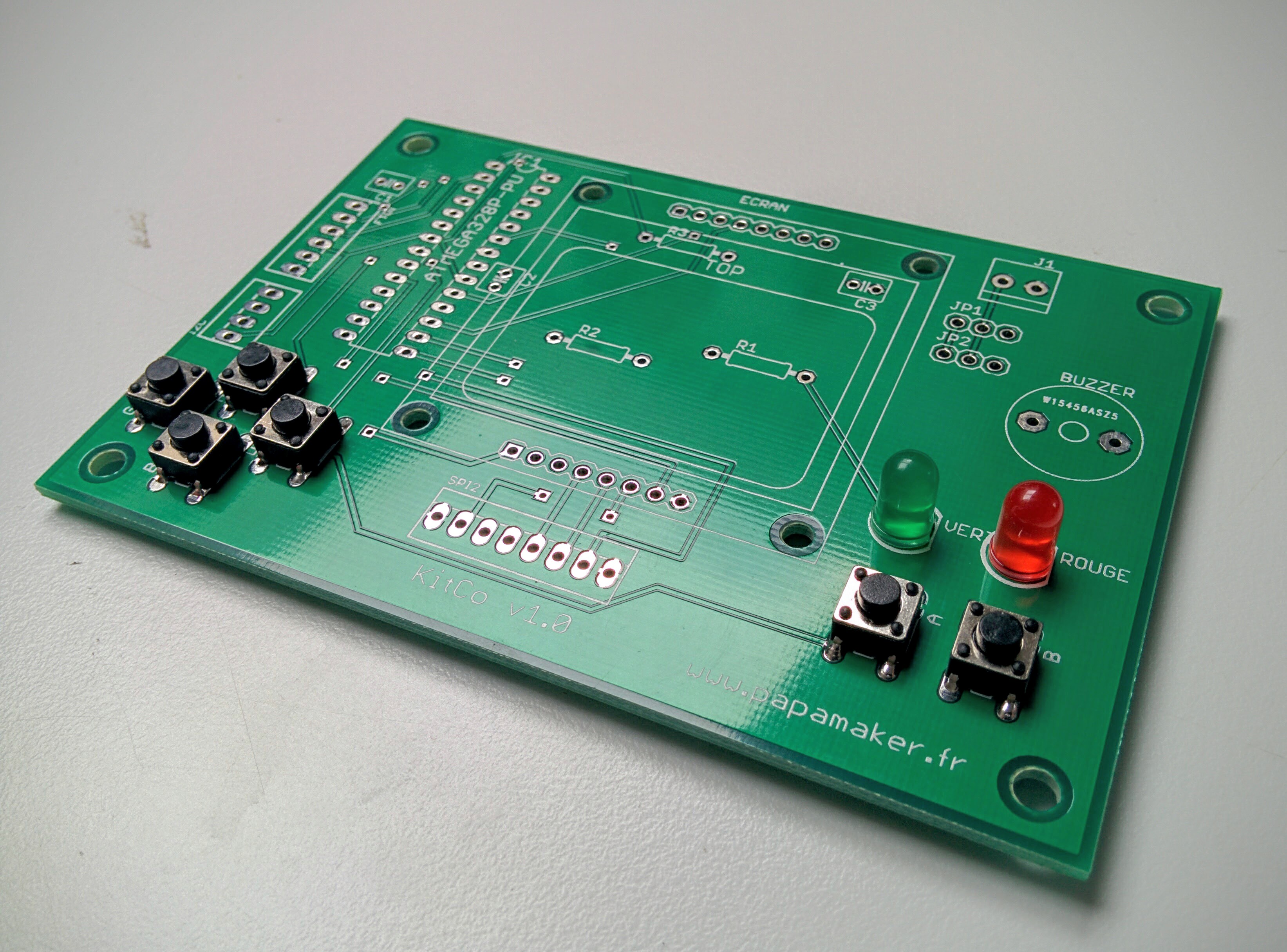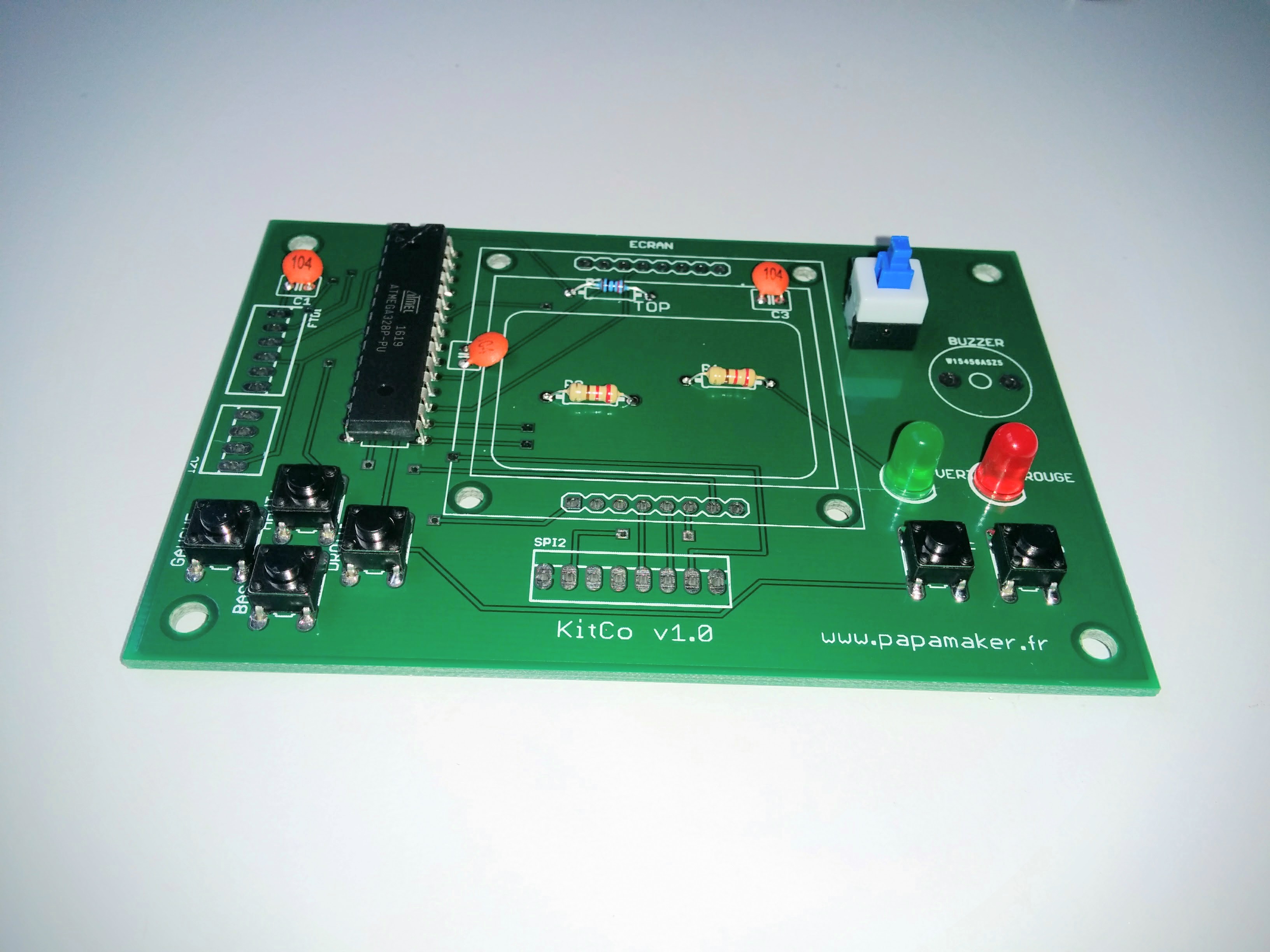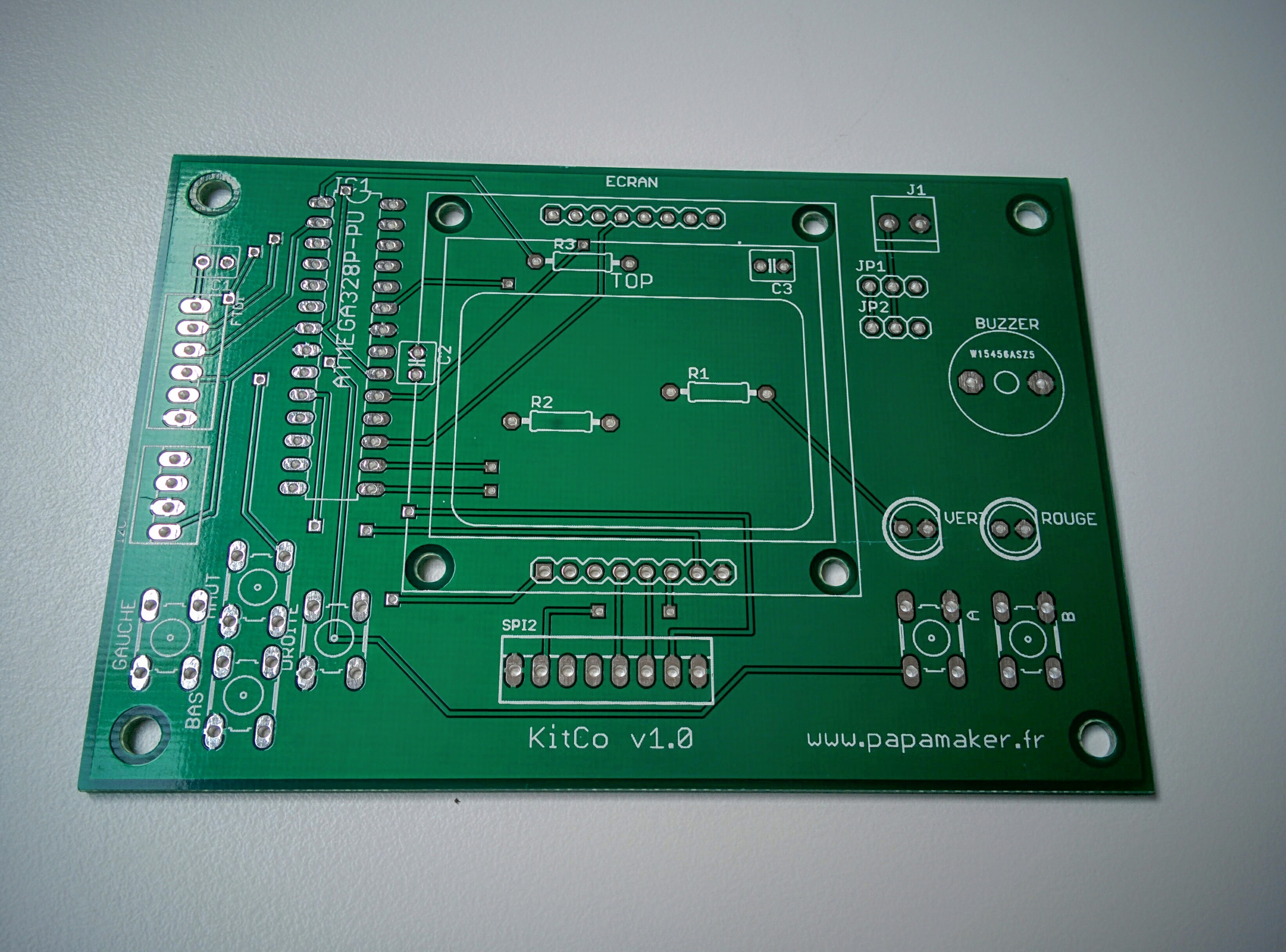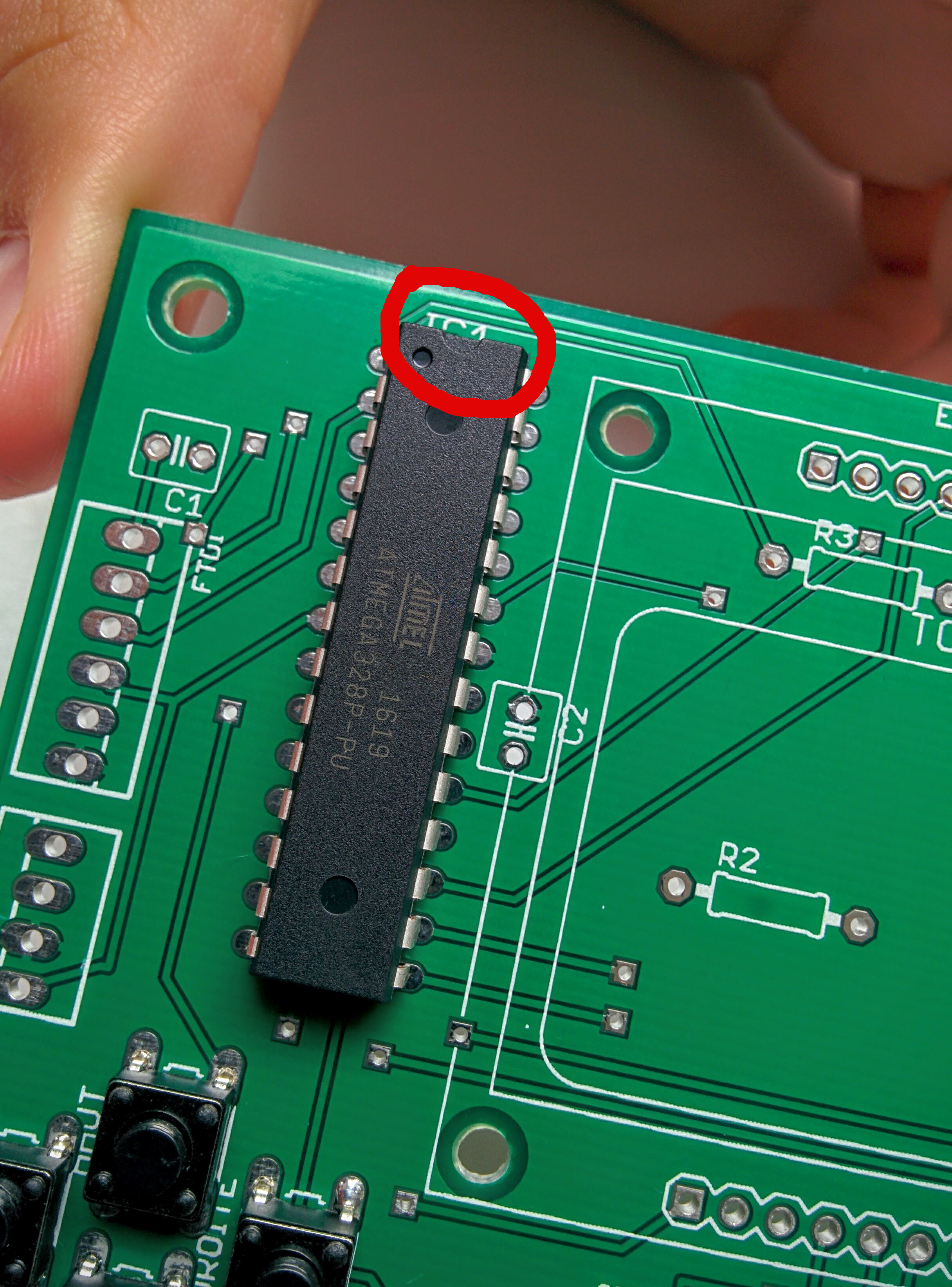 ATTENTION: Le microcontrôleur a un sens! Il faut que le détrompeur (demi cercle creux sur le bord) soit vers le haut du circuit imprimé (voir photo).