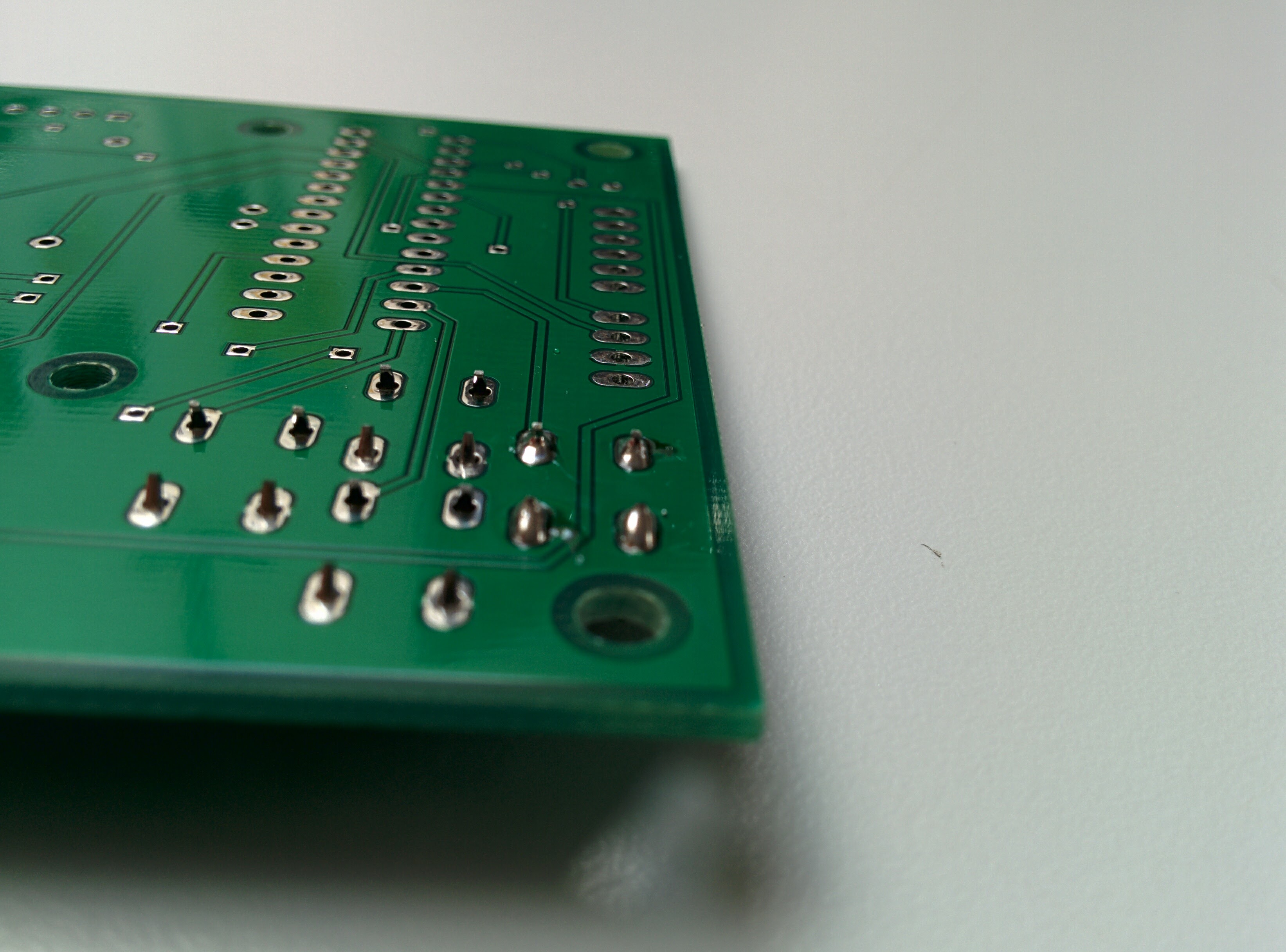 Sur la face arrière, les broches des boutons doivent bien dépasser. Sur la photo, on voit les quatre broches de droite qui sont soudées. (une belle soudure doit faire une forme de « petite montagne »)