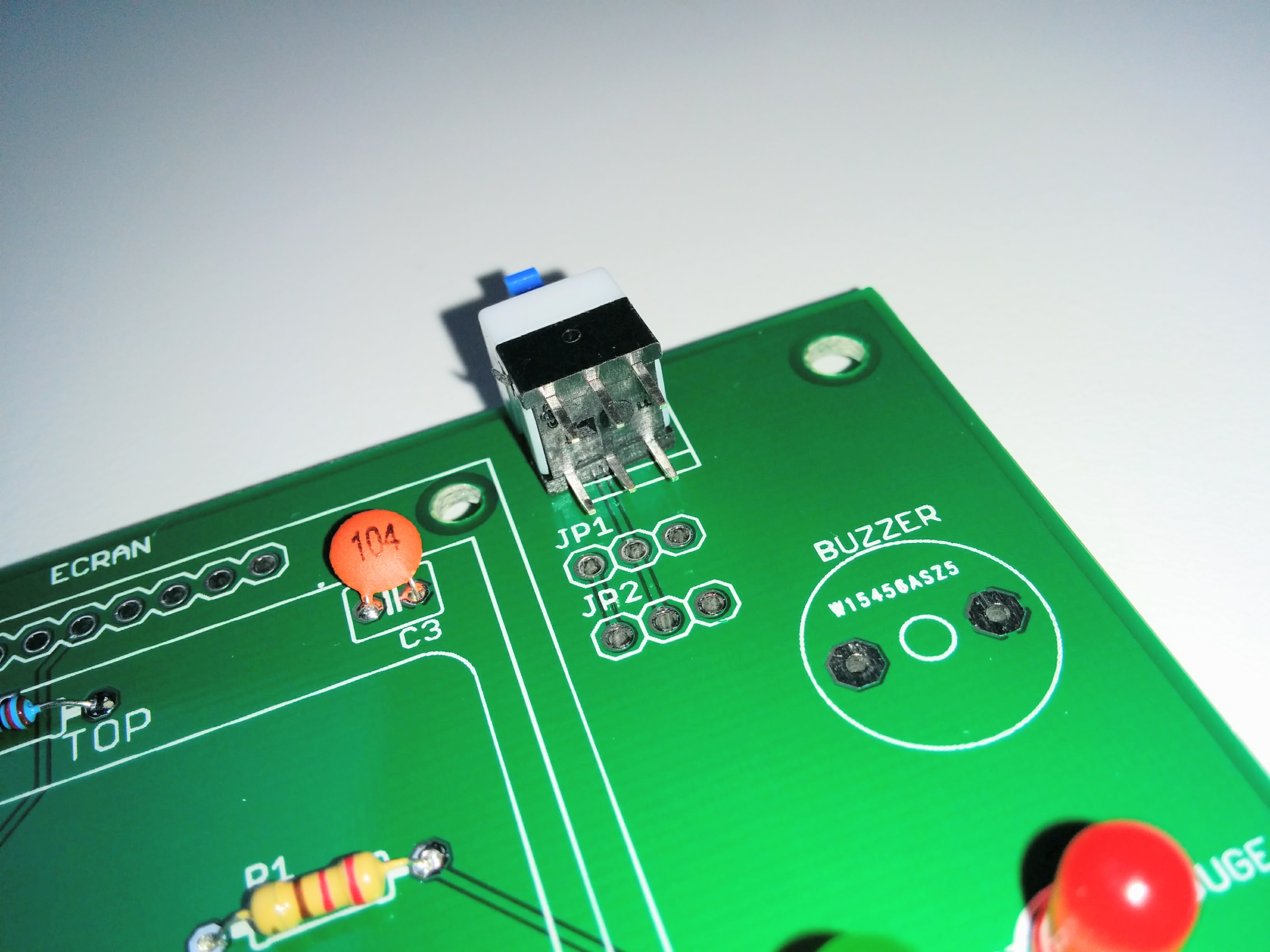Pour souder le buzzer, contrairement aux autres composants, on va amener les fils par le dessous.